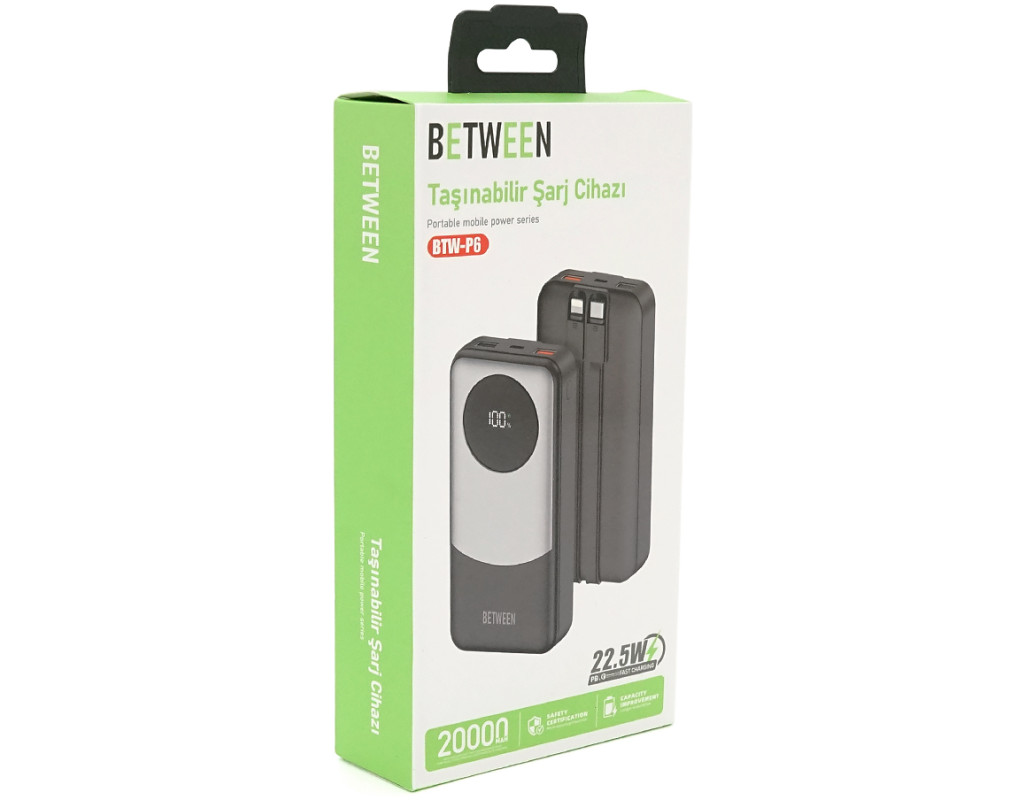 Power bank BETWEEN BTW-P6 20000mAh, 22.5W, 2 кабелі: Type-C+Lighting, Black, 460g, Box