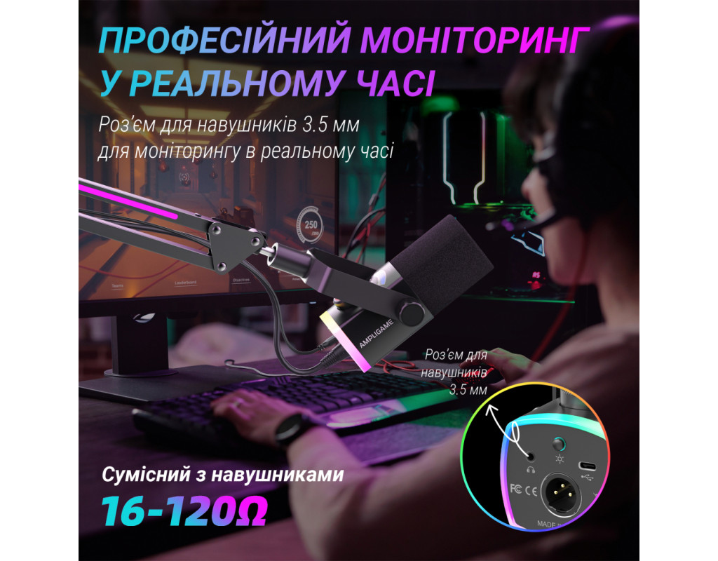 FIFINE AmpliGame AM8PROT – професійний стрімінговий комплект «все-в-одному» Захоплюйте голосом, а не шумом. Комплект FIFINE AmpliGame AM8PROT – це готове рішення для тих, хто прагне професійного звучання та вражаючої подачі. Поєднуючи динамічний мікрофон високої чутливості, міцну RGB-стійку пантограф та просунутий аудіоконтроль, він дозволяє передати кожну емоцію вашого голосу без зайвих перешкод.