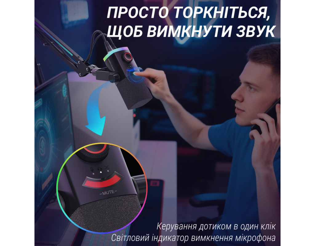 2. Масштабна персоналізація RGB-підсвітки Створюйте унікальну візуальну атмосферу за допомогою палітри з понад 160 мільйонів кольорів та ефектів. Налаштовуйте підсвітку свого мікрофона, стійки або гарнітури так, як того вимагає ваш контент або настрій.