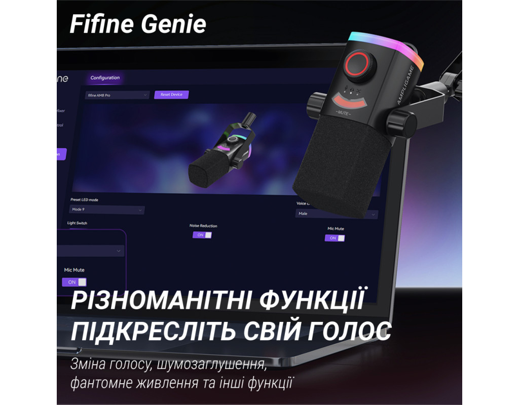 Програмне забезпечення FIFINE Genie — це потужний, але простий у використанні інструмент, створений для геймерів, стрімерів та авторів контенту, який використовують обладнання FIFINE. Воно дозволяє повноцінно керувати звуком та візуальними ефектами, перетворюючи ваш простір на професійну сцену.