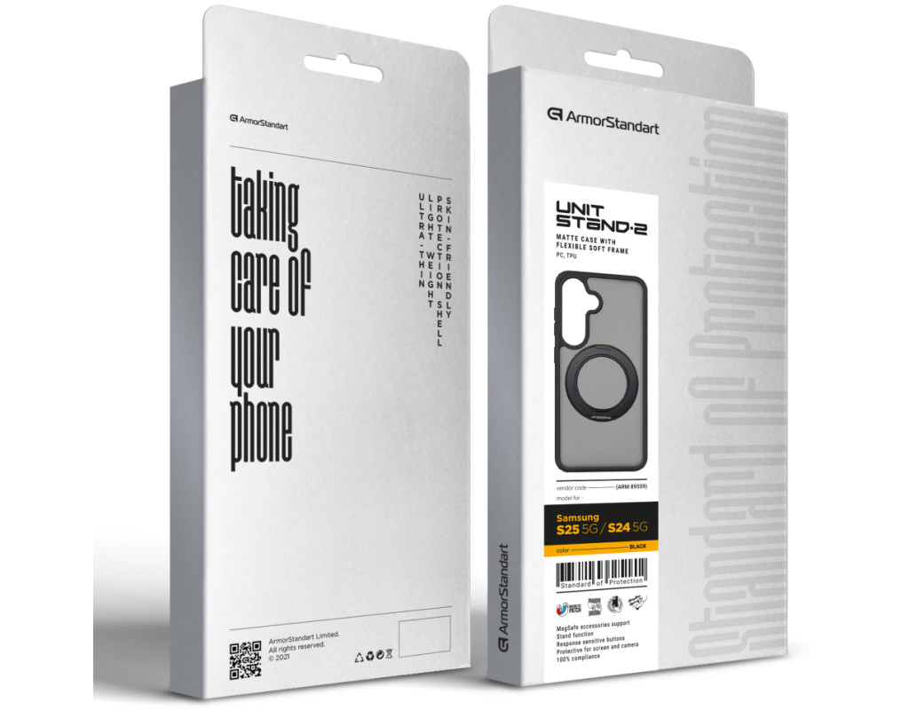 ArmorStandart Unit Stand2 — захисний чохол для Samsung з вбудованою поворотною підставкою та магнітною сумісністю. Модель розрахована на щоденну експлуатацію, де важливі стабільне утримання смартфона, можливість фіксації під кутом і збереження повної функціональності пристрою.