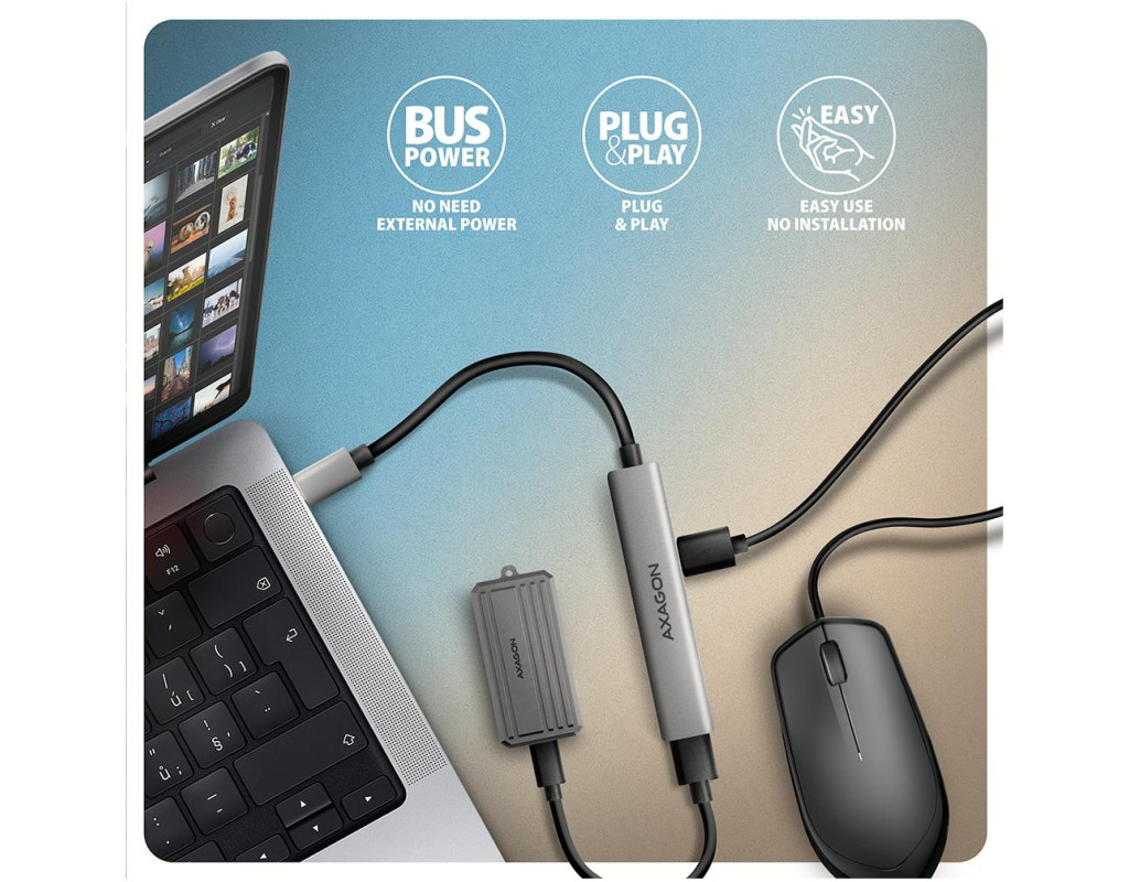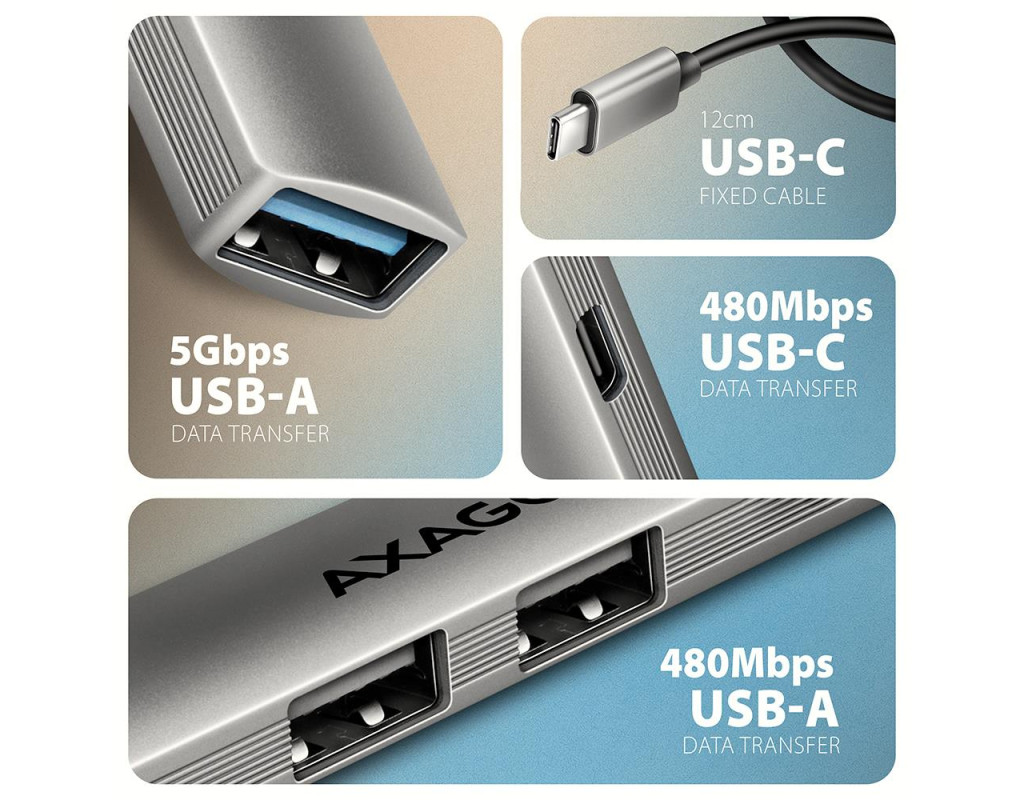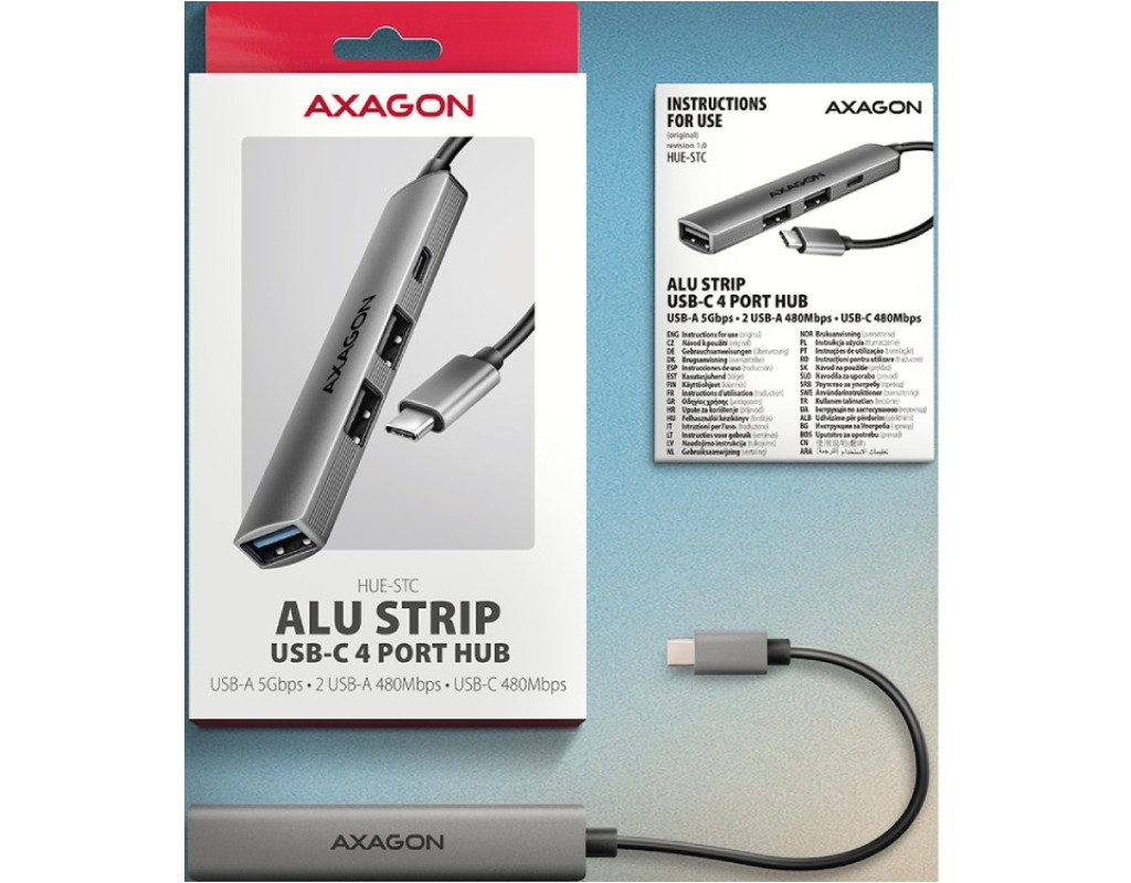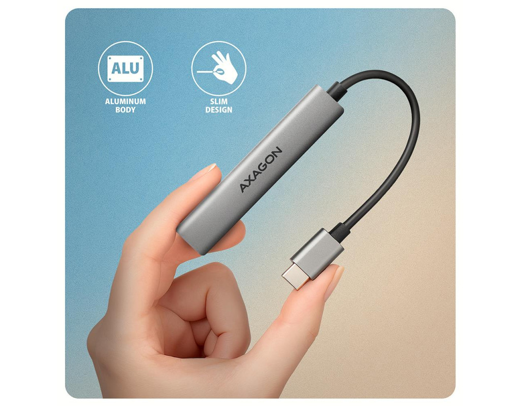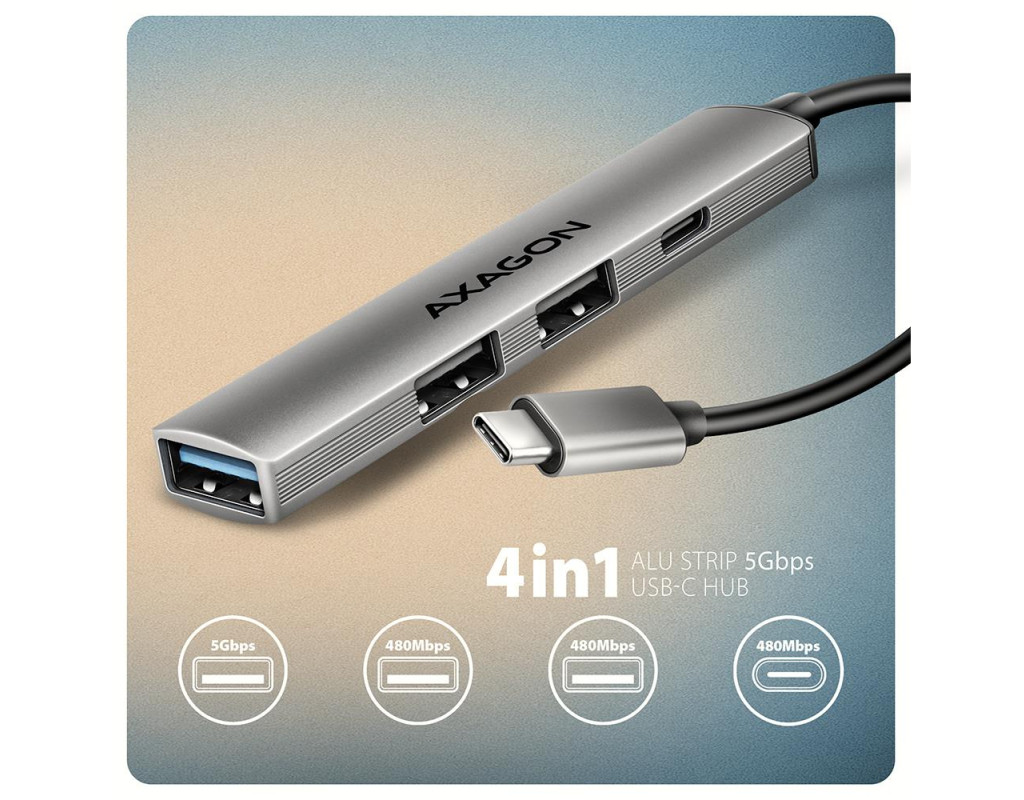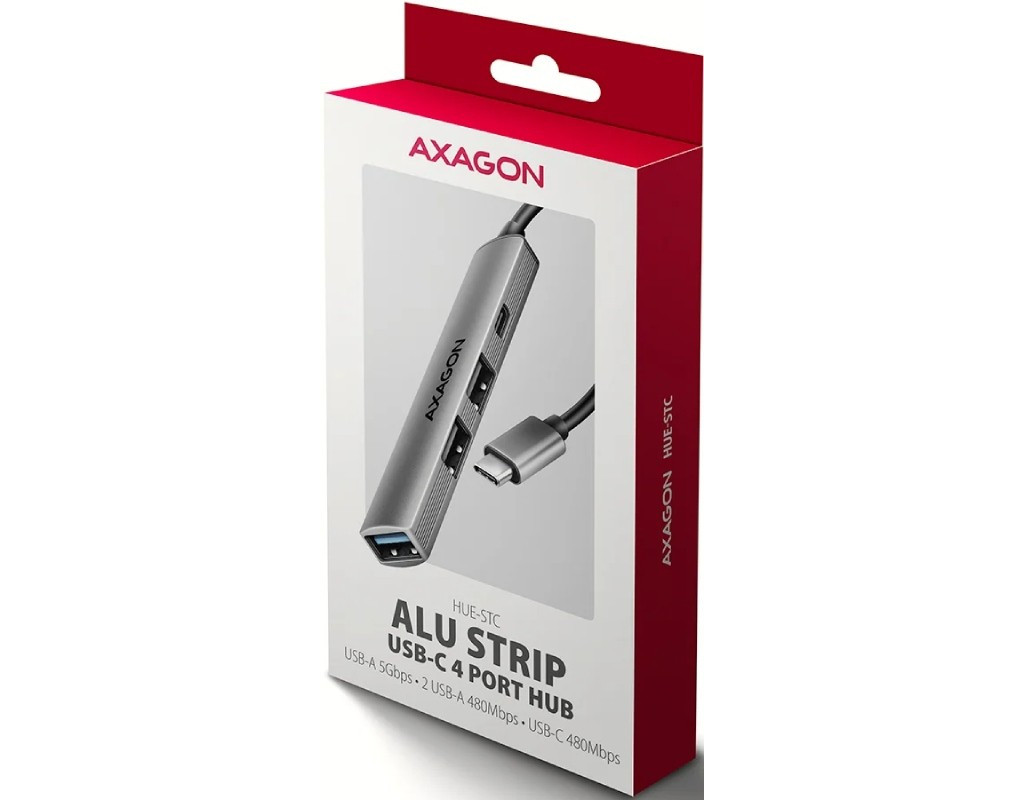 | Максимум можливостей у мінімальному форматі AXAGON HUE‑STC — це легкий і надзвичайно портативний 4‑портовий USB‑C хаб, створений для тих, кому потрібно швидко та зручно підключати декілька пристроїв одночасно. Він ідеально доповнює сучасні ноутбуки та смартфони з обмеженою кількістю роз’ємів. Корпус зі справжнього алюмінію забезпечує приємний на дотик преміальний вигляд, високу зносостійкість і природне пасивне охолодження. Оптимальний набір USB‑портів для щоденних задач Хаб пропонує універсальну конфігурацію роз’ємів, розраховану на роботу з різними типами пристроїв: