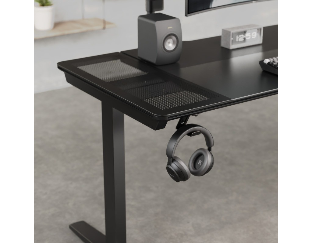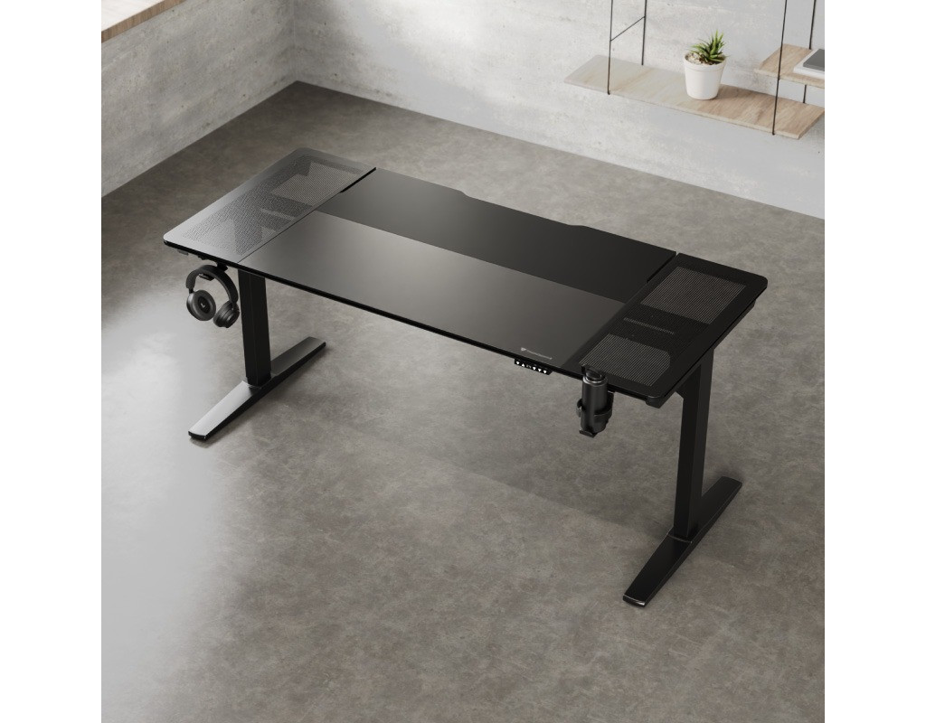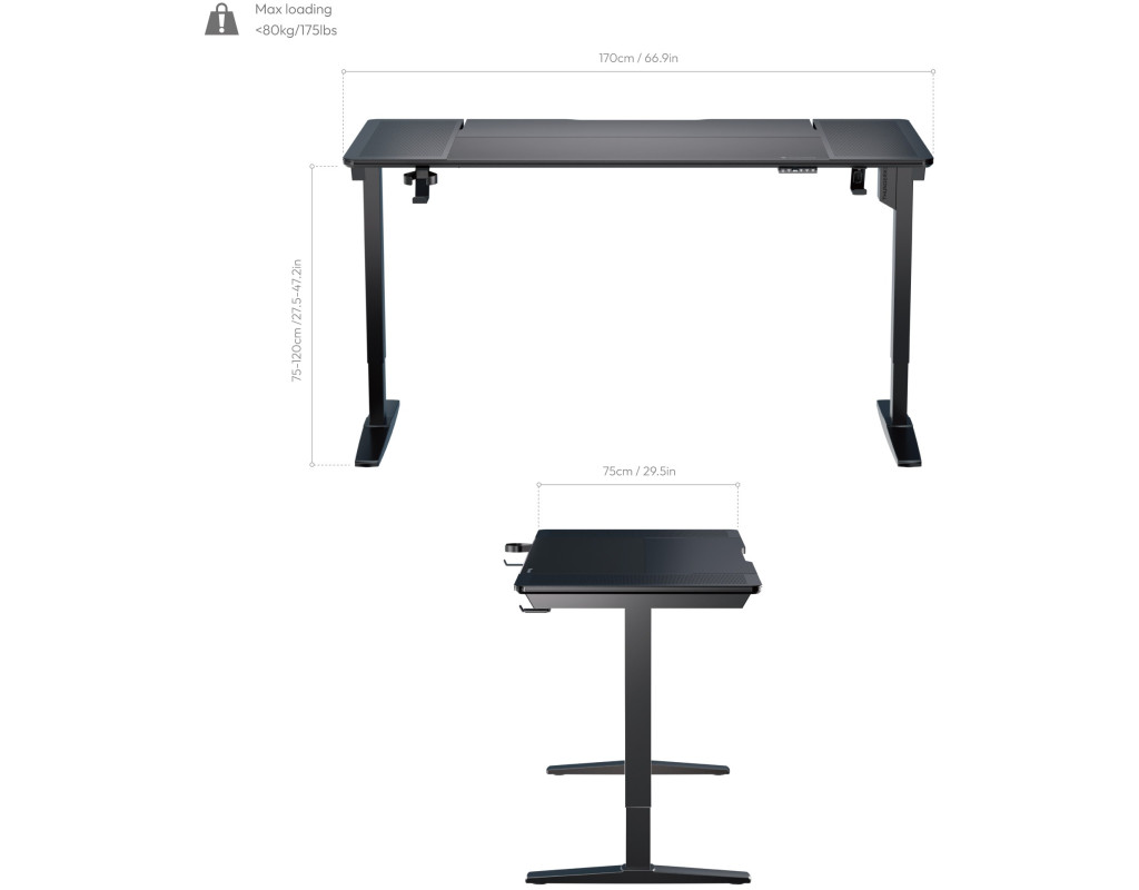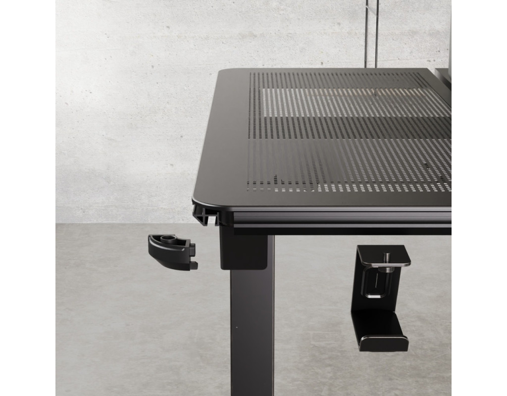 | Ергономічний стіл LAB-X має стільницю розміром 170 x 75 см із моторизованим регулюванням висоти від 75 до 120 см для плавних і безшумних переходів. Його автоматичне опускання, що запобігає зіткненням, забезпечує безпеку, а сітчаста бічна панель покращує забір повітря для ПК. Завдяки алюмінієвій рамі цей стіл поєднує функціональність та гнучкість, створюючи ідеальну робочу станцію для ігор, роботи, навчання тощо.