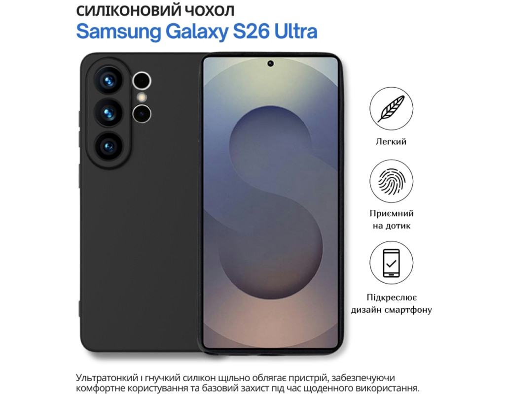 | "Тонкий і еластичний силіконовий чохол забезпечує надійний захист вашого смартфона від механічних пошкоджень, запобігаючи появі подряпин на корпусі. Завдяки високій якості матеріалу, чохол зберігає свою цілісність — він не рветься та не тріскається навіть при тривалому використанні. Чохол легко встановлюється, щільно прилягає до поверхні смартфона, не залишаючи повітряних зазорів, які могли б накопичувати пил, бруд або вологу. Легкий і непомітний, він не додає зайвого об'єму чи ваги вашому пристрою, забезпечуючи надійний захист від ударів, пошкоджень і вологи. Усі вирізи в чохлі точно відповідають роз'ємам і функціональним кнопкам смартфона, що гарантує зручне користування в будь-яких умовах. Силіконове покриття не ковзає, щільно облягає металевий корпус телефону та не перешкоджає доступу до роз'ємів для зарядки, USB-кабелю, гарнітури чи сканера відбитків пальців. Цей силіконовий чохол стане ідеальним вибором для тих, хто шукає стильний і практичний аксесуар для свого смартфона." |