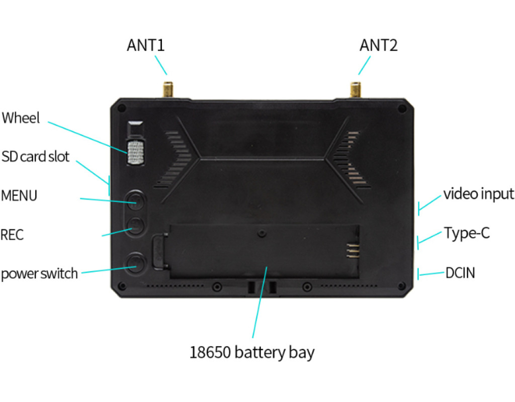 ХАРАКТЕРИСТИКИ: Модель: M5 DVR Розмір екрану: 5' Роздільна здатність: 800х480 Затримка відео: до 20мс Частота: 5.0-5.9GHz Кількість каналів: 56CH Джерело живлення: 2-6s DC in/18650LIon/Type-C USB Час автоновної роботи: 1,5 години з 3000mAh Тип антен: RPSMA male Розміри: 135x88x16 мм Вага: 165 г