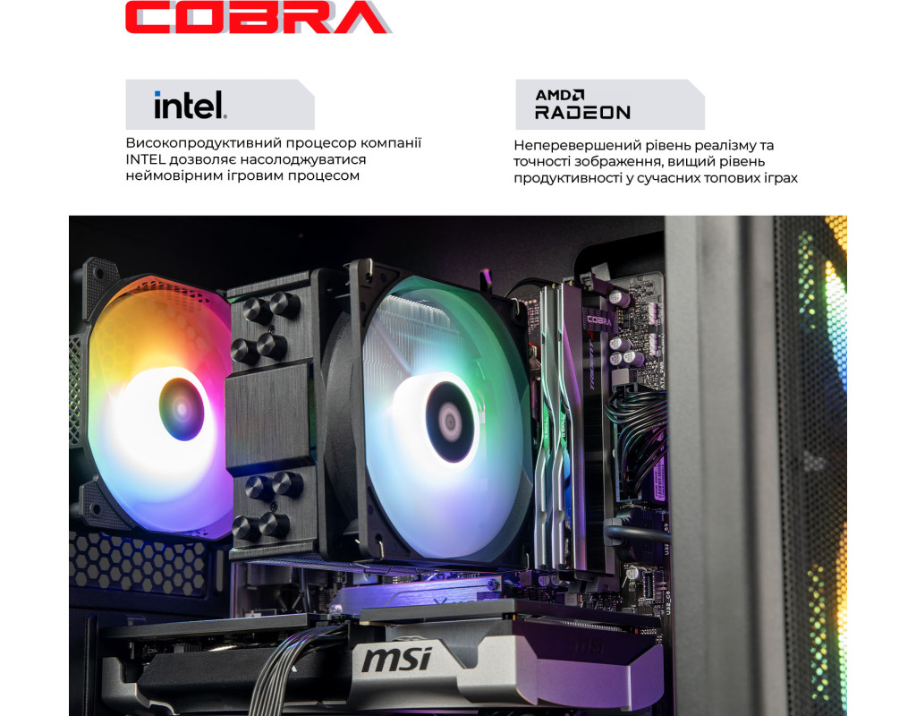 ПК COBRA збираються на базі комплектуючих визнаних світових лідерів, таких як Intel, AMD, MSI, ASUS, Zalman, Prologix, Seagate, Toshiba, Hitachi, Transcend, Kingston і ін.