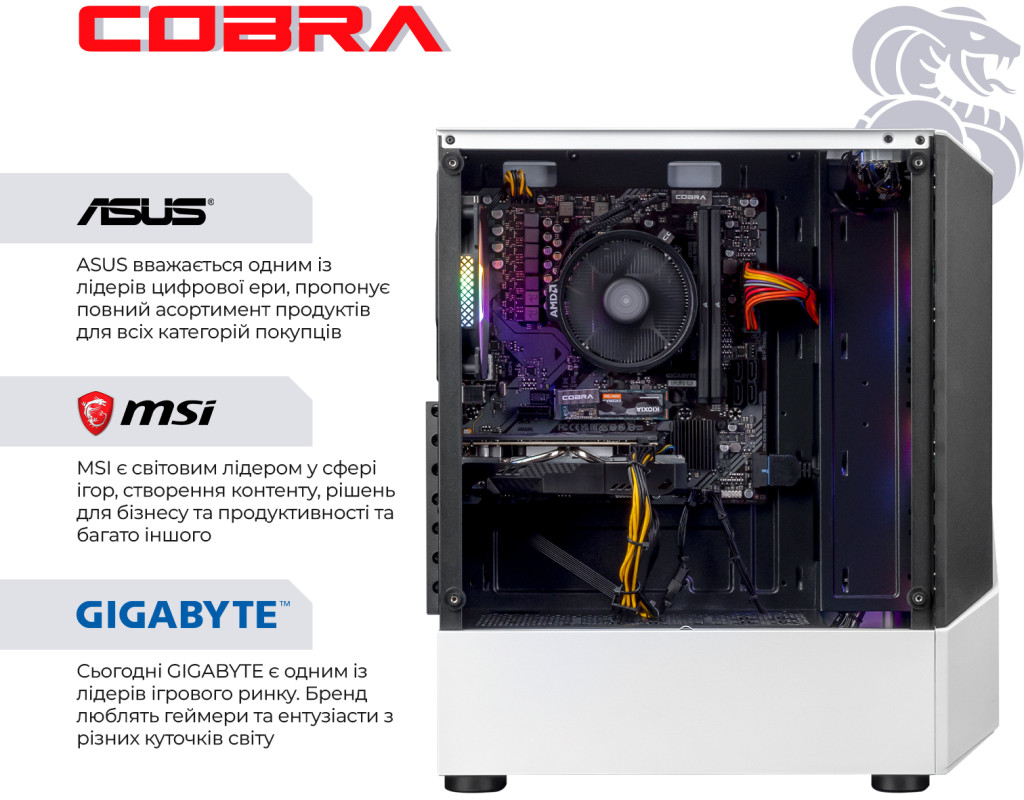 ПК COBRA збираються на базі комплектуючих визнаних світових лідерів, таких як Intel, AMD, MSI, ASUS, Zalman, ProLogix, Seagate, Toshiba, Hitachi, Transcend, Kingston і ін.