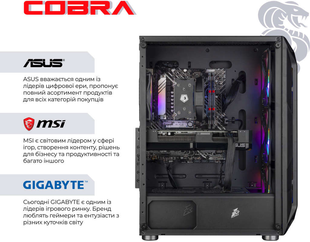 ПК COBRA збираються на базі комплектуючих визнаних світових лідерів, таких як Intel, AMD, MSI, ASUS, Zalman, ProLogix, Seagate, Toshiba, Hitachi, Transcend, Kingston і ін.