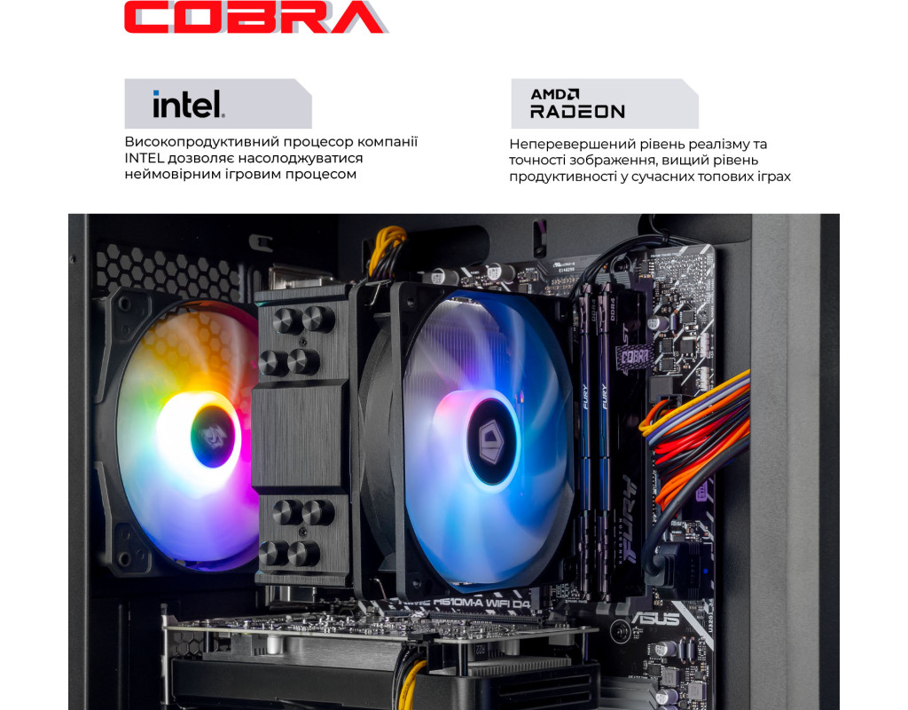 ПК COBRA збираються на базі комплектуючих визнаних світових лідерів, таких як Intel, AMD, MSI, ASUS, Zalman, ProLogix, Seagate, Toshiba, Hitachi, Transcend, Kingston і ін.