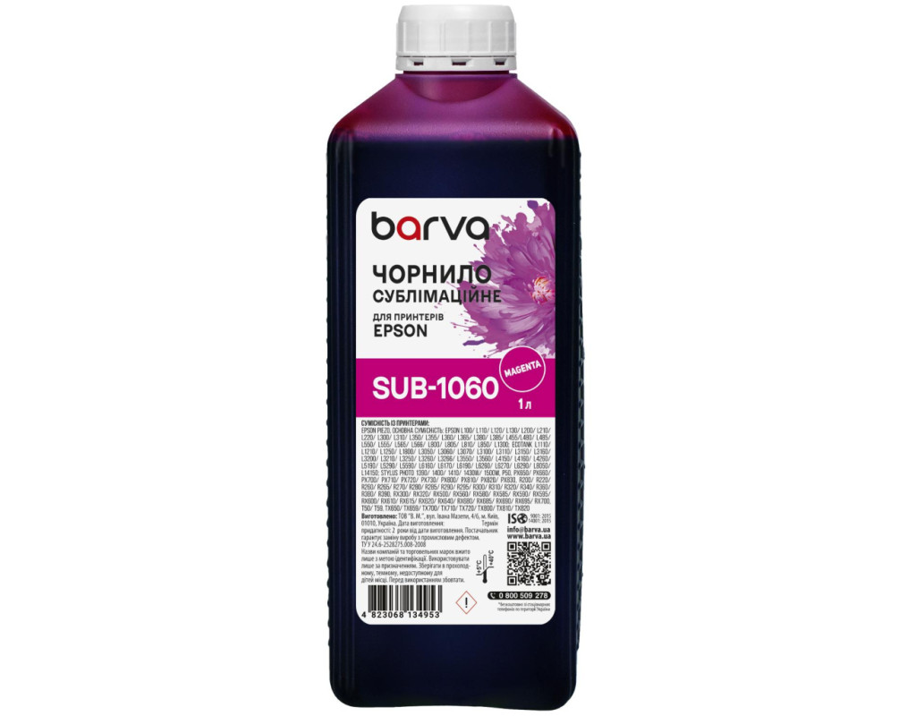 | Сублімаційні чорнила – спеціальний тип чорнил, що використовується для перенесення зображень на текстиль, метал, кераміку, пластик і т.д. Чорнило сублімаційне для настільних принтерів Epson 1 л, пурпурове Barva (SUB-1060) використовується для заправки настільних принтерів Epson. Чорнила SUB-1060 Barva мають офіційну гарантію – АТ000953. При виборі чорнила Вам також необхідно звернути увагу на колір картриджа, який плануєте заправляти. Ці чорнила Barva мають колір – magenta (пурпурний). Виробник гарантує безперебійну роботу чорнил протягом всього терміну використання, який складає – 2 роки. Тип чорнил SUB-1060 Barva – Сублімаційні. Українська компанія ТОВ «В.М.» виготовляє чорнила під торговою маркою Barva вже багато років. На базі власної лабораторії відбувається як розробка нових формул, так і неперервний контроль якості продукції, що випускається. При виробництві чорнил виробник слідує стандартам ISO 9001:2015 та ISO 14001:2015. Для досягнення найкращого результату в передачі кольору та стійкості до світла ми рекомендуємо використовувати комбінацію – Спеціальний папір для сублімаційного друку Barva + чорнила Barva. Дана фарба для принтера Epson Barva має фасовку – 1 л, що має наступні особливості: Чорнила для принтера Epson SUB-1060 Barva 90 гр./100 мл розфасовані в спеціальні флакони для зручної заправки; Ретельно підібраний поліетиленовий флакон має зручну насадку-носик, яка дозволяє легко заправити картриджі чи резервуари принтера без шприца; Невеликий об’єм чорнил ідеально підходить для користувачів, які друкують небагато; Чистота при заправці завдяки зручному флакону; Заправка в резервуар принтера: Зніміть кришку з флакону, відкрийте заглушки на резервуари з чорнилами на пристрої; Переконайтеся, що немає помилки з кольором чорнил; За допомогою носика на флаконі перелийте чорнила в ємності пристрою. Чорнила SUB-1060 Barva, поради щодо використання: Підготуйте майбутній малюнок для переносу у дзеркальному зображенні. Надрукуйте тестовий аркуш для перевірки, чи все правильно зроблено. Перенесіть підготовлене зображення на необхідну поверхню за допомогою термопресу. Якщо плануєте переносити зображення на текстиль, обирайте тканину із вмістом синтетики не менше 50%. Ви можете купити Чорнило сублімаційне для настільних принтерів Epson 1 л, пурпурове Barva (SUB-1060) в нашому інтернет-магазині з доставкою по Києву та всій Україні. |