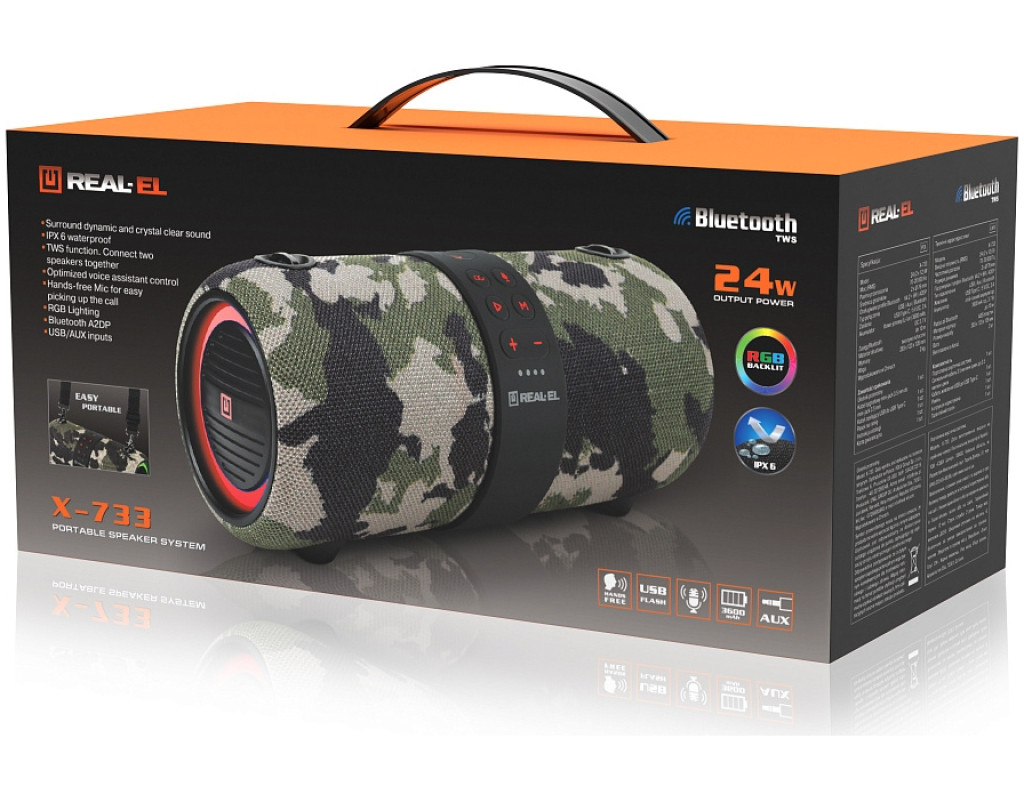 | Акустична система REAL-EL X-733 Сamo (4743304106011) – це поєднання стильного дизайну, портативності та якісного звучання у компактному форматі. Завдяки своїм технічним характеристикам, ця мультимедійна система стає ідеальним вибором для всіх, хто бажає насолоджуватися улюбленою музикою завжди і всюди. В основі REAL-EL X-733 – сучасні технології, що забезпечують бездротове підключення. Інтерфейси USB-C та Bluetooth дозволяють легко під'єднати мобільні пристрої, телевізори або ноутбуки. Якщо ж ви віддаєте перевагу класичним способом підключення, то передбачено роз'єм AUX. Завдяки цьому можна швидко розпочати вечірку з улюбленими треками. Однією з ключових переваг є потужність колонок у 24 Вт, забезпечуючи насичене і чисте звучання. Пасивні випромінювачі додають глибини низьким частотам, піднімаючи аудіосприйняття на новий рівень. Матеріали корпусу – текстиль, пластик та гума – не лише дарують естетичний вигляд, а й захищають пристрій від можливих пошкоджень. Більш того, система оснащена RGB-підсвічуванням та функцією TWS, що додає яскравості та об’єму звуку, перетворюючи будь-який простір у танцпол. Вбудований мікрофон з функцією HANDS FREE спрощує керування дзвінками, а кнопка виклику помічника відкриває нові можливості для інтерактивного спілкування. До того ж, захист IPX6 гарантує стійкість системи до води, тож ви зможете насолоджуватися музикою під дощем або на пляжі без страху пошкодити пристрій. Камуфляжний колір додає нотку оригінальності та підкреслить вашу індивідуальність. Живлення від акумулятора робить її ідеальним супутником на природі, дозволяючи забути про розетки та дроти. REAL-EL X-733 Сamo – це більше, ніж просто акустична система; це ваш настрій, стиль і бездоганне звучання в будь-який момент життя. |
