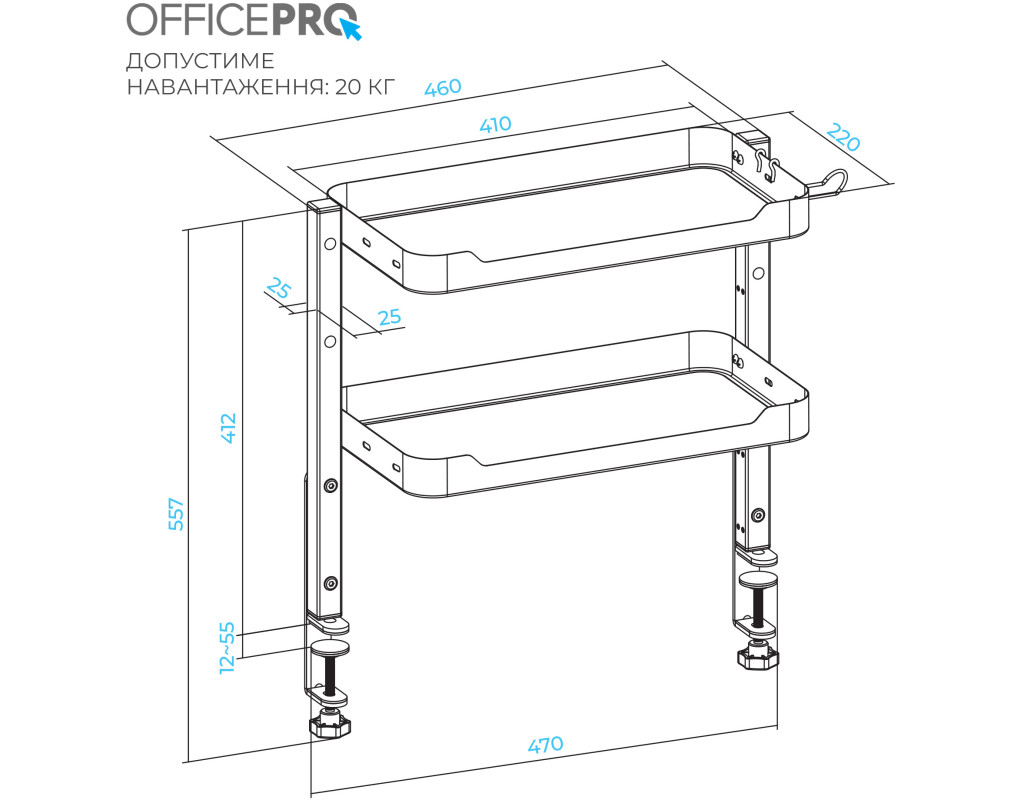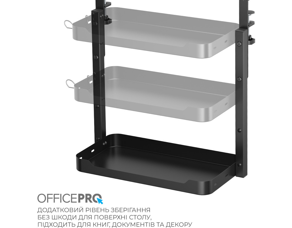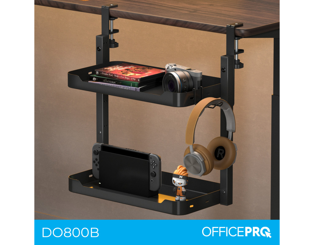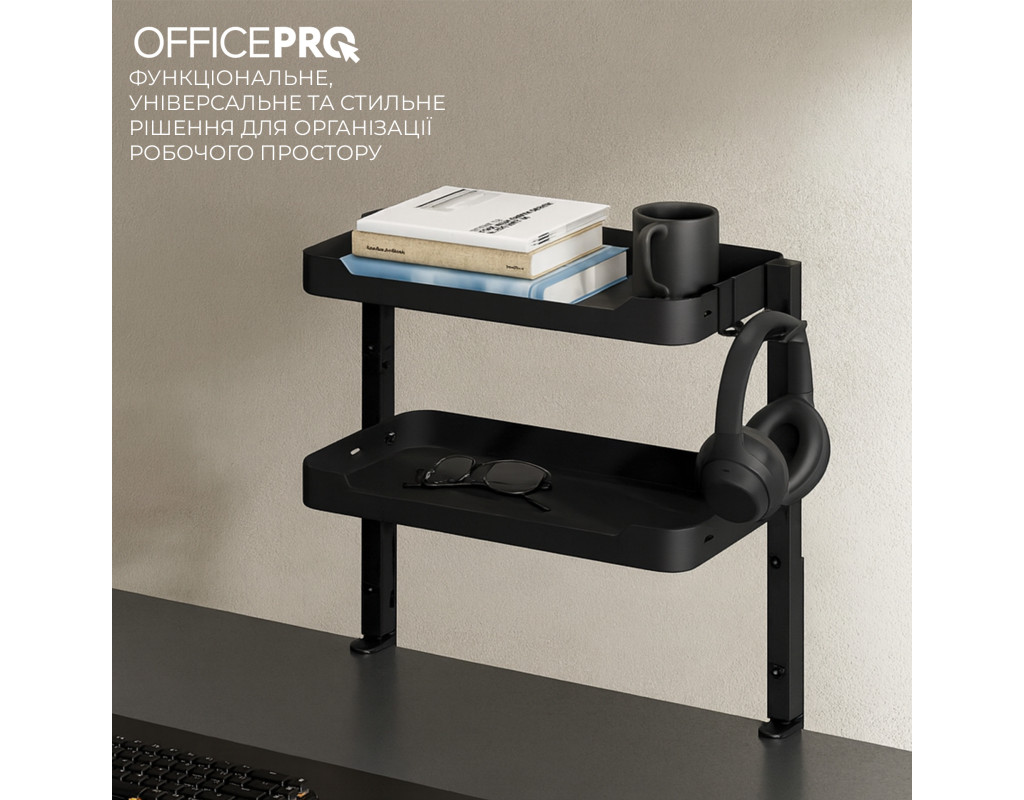 | Підставка органайзер Officepro DO800B — стильне й функціональне рішення для організації робочого простору. Конструкція кріпиться до краю столу за допомогою надійних затискачів , який не пошкоджує поверхню робочого столу і дозволяє встановити органайзер як зверху, так і знизу столу. Підставка має двоярусну структуру: верхня поличка з обмежувачем не дає дрібним предметам випадати, а нижня полиця регулюється по висоті, що дозволяє зберігати речі різного розміру.