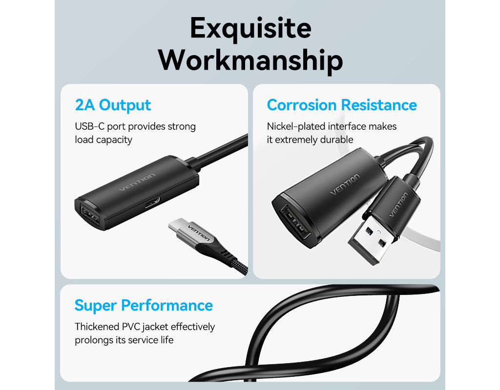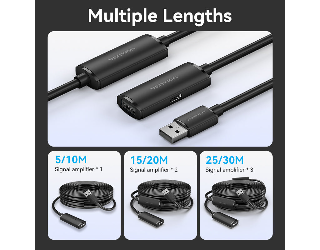 Активний подовжувач Vention 15 м USB 2.0 Type-A (тато) на Type-A (мама) з підсилювачем сигналу та додатковим живленням USB-C, Чорний Цей високоякісний активний подовжувач Vention довжиною 15 метрів розроблений для подолання обмежень стандартних USB-кабелів, забезпечуючи стабільне з'єднання на великій відстані. Завдяки вбудованій електроніці він ідеально підходить для підключення віддалених периферійних пристроїв, таких як принтери, сканери, веб-камери, Wi-Fi адаптери або контролери, без втрати якості сигналу чи швидкості передачі даних. Міцна конструкція та надійні матеріали роблять його відмінним вибором як для офісного, так і для домашнього використання, гарантуючи ефективну роботу обладнання, розташованого далеко від комп'ютера. Обов'язкова примітка Для забезпечення коректної роботи даного активного подовжувача передбачено порт додаткового живлення стандарту USB-C, розташований на корпусі вихідного роз'єму; підключення зовнішнього джерела живлення 5В до цього порту є суворою технічною вимогою у випадках, коли споживання енергії підключеним пристроєм перевищує 0,5 А, наприклад, при використанні зовнішніх жорстких дисків або потужних мережевих адаптерів, оскільки без додаткового живлення можливі перебої в роботі або відсутність розпізнавання обладнання системою. Ключові особливості: - Активна система подвійного підсилення сигналу: Кабель оснащений двома вбудованими електронними чіпами-репітерами, розміщеними вздовж лінії, які регенерують та підсилюють вхідний сигнал для його передачі на відстань 15 метрів без загасання. Ця технологія дозволяє зберегти цілісність пакетів даних та забезпечити стабільну швидкість обміну інформацією, що є критично важливим для коректної роботи пристроїв, чутливих до затримок або втрати сигналу, відрізняючи цей продукт від звичайних пасивних подовжувачів.