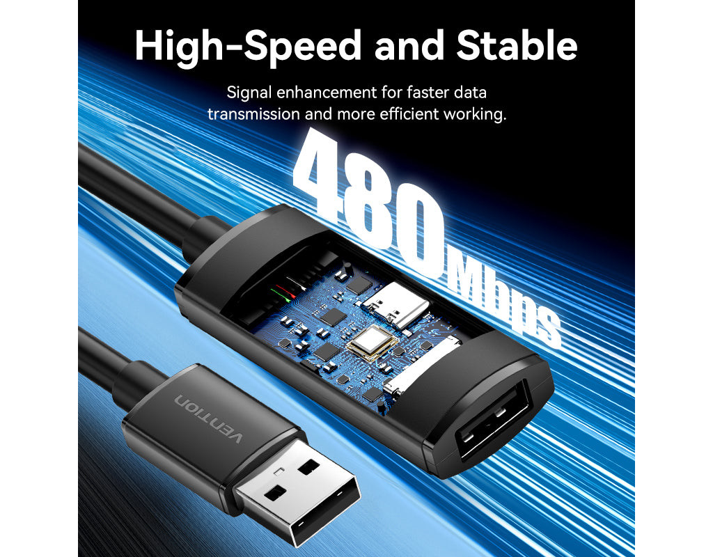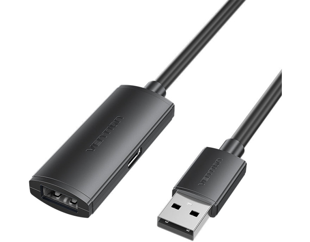 Активний подовжувач Vention USB 2.0 25 м (CBKBS) Активний подовжувач Vention довжиною 25 метрів — це надійне рішення для підключення USB-пристроїв, розташованих на значній відстані від комп'ютера або ноутбука, де звичайні пасивні кабелі не можуть забезпечити стабільний сигнал. Цей аксесуар ідеально підходить для організації робочого простору в офісі, на складі або вдома, дозволяючи вільно розміщувати принтери, сканери, веб-камери, Wi-Fi адаптери та іншу периферію без втрати швидкості передачі даних. Завдяки продуманій конструкції з вбудованими підсилювачами та якісним матеріалам, кабель гарантує чіткий обмін інформацією без затримок та перешкод, забезпечуючи комфортну роботу з технікою незалежно від її розташування в приміщенні. Обов'язкова примітка Ця модель активного подовжувача оснащена вбудованим портом USB-C для подачі додаткового живлення, яке є обов'язковим для підключення, якщо номінальний струм споживання під'єднаного до подовжувача периферійного пристрою перевищує 0,5 А або якщо спостерігається нестабільна робота обладнання через велику довжину лінії. Ключові особливості: - Активна система підсилення сигналу: Кабель обладнаний інтегрованими електронними чіпами-репітерами, які регенерують та підсилюють сигнал даних по всій довжині проводу. У модифікації довжиною 25 метрів передбачено три блоки підсилення, розташовані вздовж кабелю, що дозволяє уникнути затухання сигналу, характерного для довгих з'єднань, і забезпечити стабільну роботу пристроїв так, ніби вони підключені безпосередньо до порту комп'ютера.