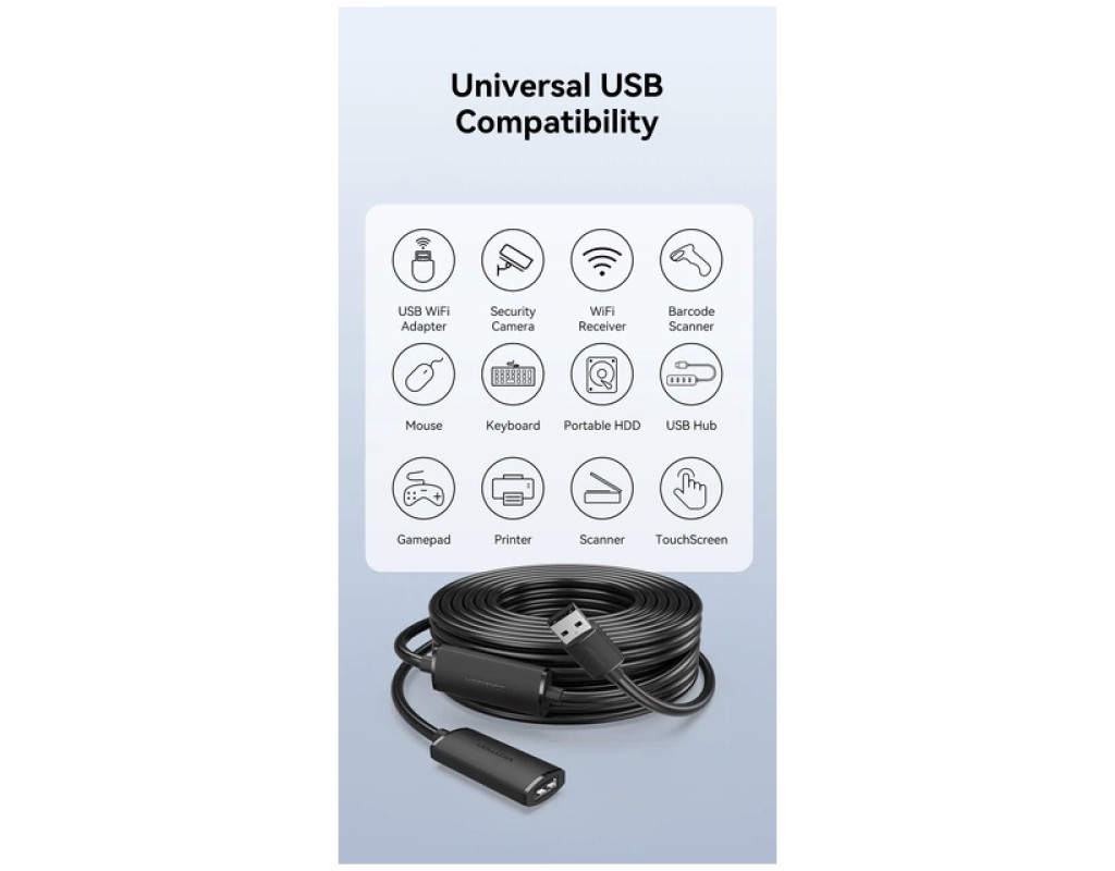 Це активний подовжувач USB 2.0 від бренду Vention з довжиною 30 метрів, призначений для подовження USB‑зв’язку між комп’ютером та периферійними пристроями за межі стандартних обмежень довжини USB‑кабелів. |