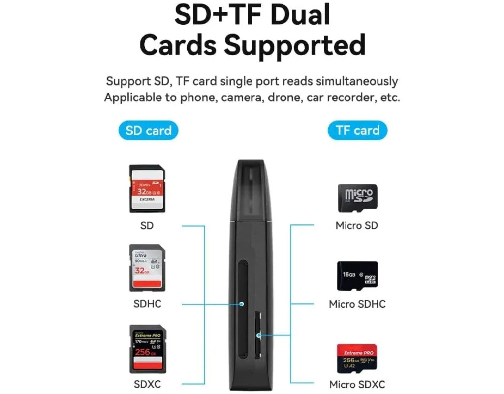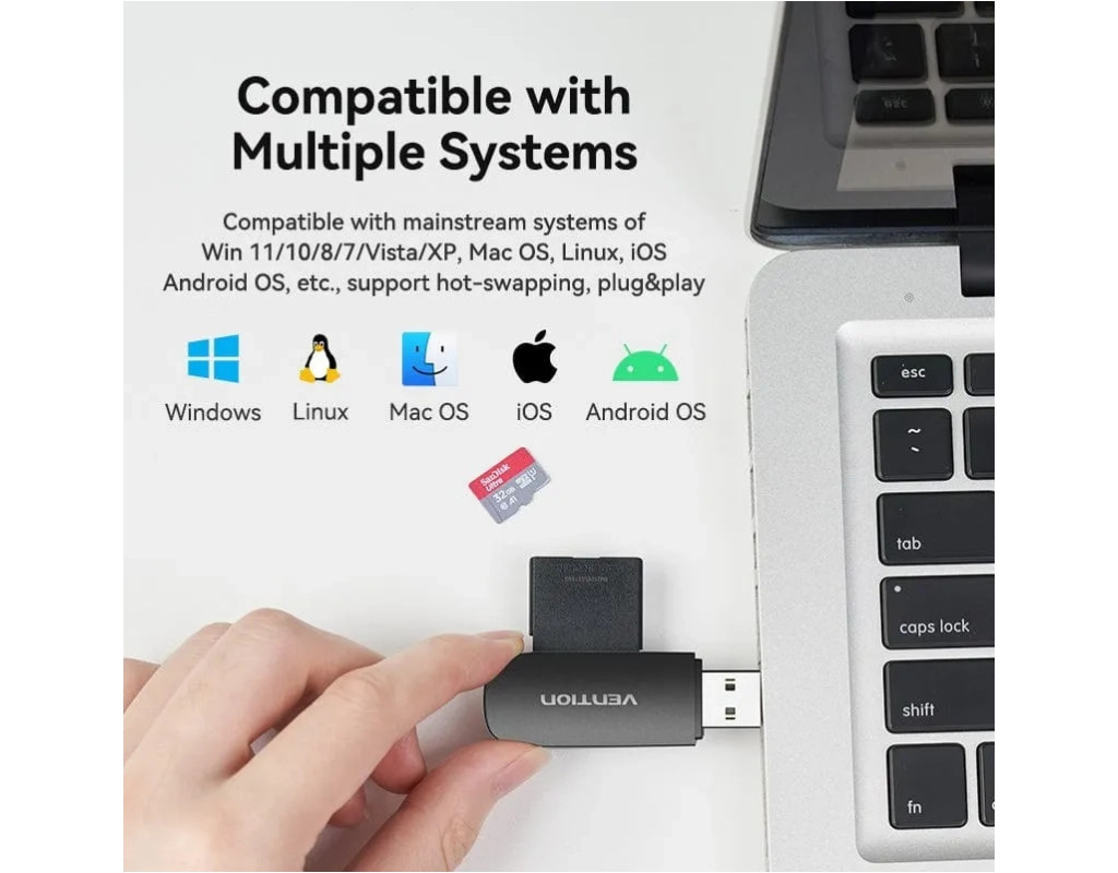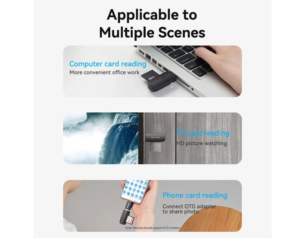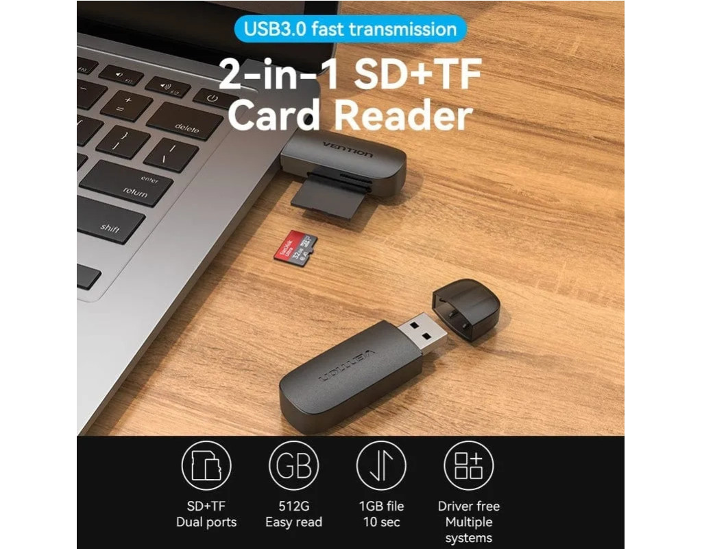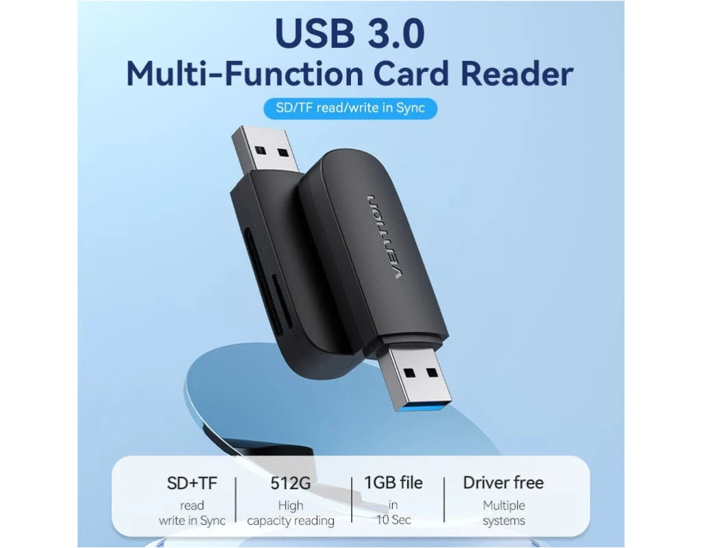 Кардрідер Vention OTG USB 3.0/TF/SD (CLGB0) призначений для зчитування і передачі даних з карток пам'яті на обладнання з роз'ємом USB. Максимальний обсяг зчитування до 512 Гб. Незамінний при підключенні карт пам'яті до ноутбука, комп'ютера, смартфона та іншого обладнання. Сумісний з ОС: MAC / Chromebook / 98SE / ME / Vista / 2000 / XP / Windows Mobile 6 / Windows 98 / Win 7 / 8. Адаптер підтримує технологію Plug and Play, тим самим, не вимагаючи встановлення додаткового програмного забезпечення та драйверів. Vention Technology Limited є одним із провідних світових виробників професійної кабельної та мультимедійної продукції. Спираючись на свій колосальний досвід розробок і споживчий досвід партнерів, інженери Vention створюють інноваційні кабелі, пристрої та аксесуари високої якості, які роблять компанію одним із лідерів у своїй галузі. |