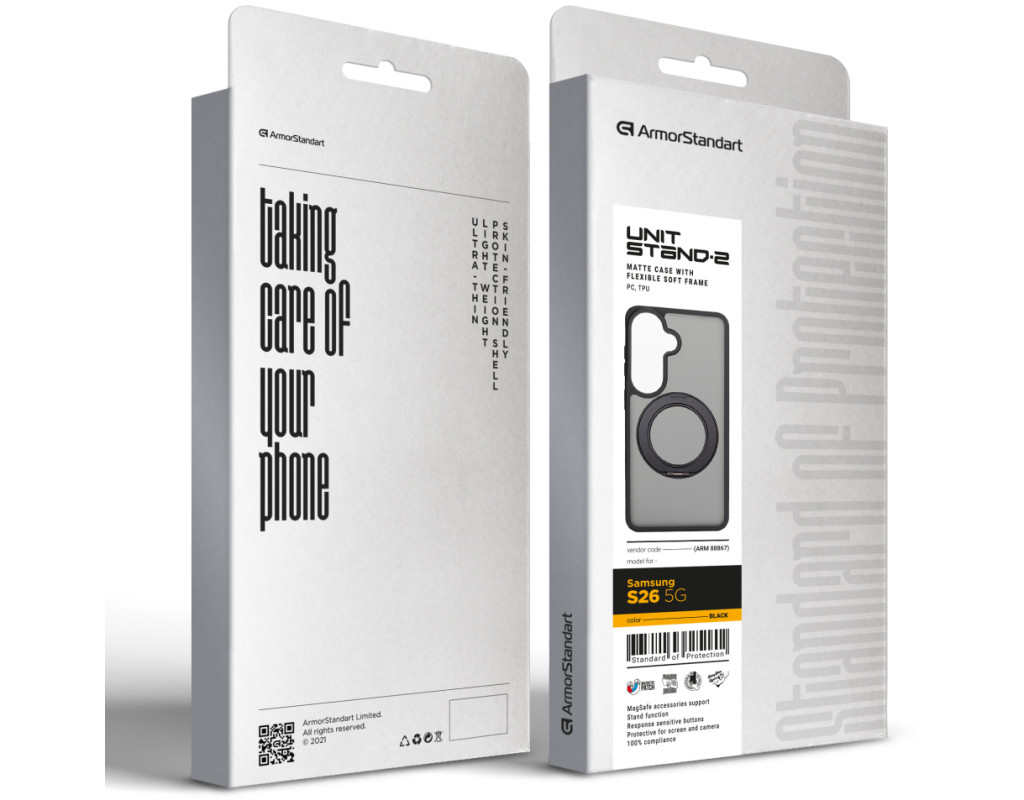 ArmorStandart Unit Stand2 — захисний чохол для Samsung з вбудованою поворотною підставкою та магнітною сумісністю. Модель розрахована на щоденну експлуатацію, де важливі стабільне утримання смартфона, можливість фіксації під кутом і збереження повної функціональності пристрою.