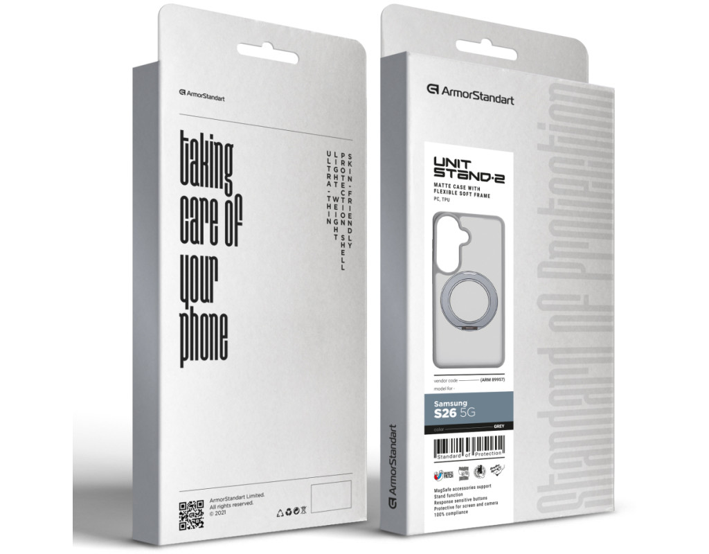 ArmorStandart Unit Stand2 — захисний чохол для Samsung з вбудованою поворотною підставкою та магнітною сумісністю. Модель розрахована на щоденну експлуатацію, де важливі стабільне утримання смартфона, можливість фіксації під кутом і збереження повної функціональності пристрою.