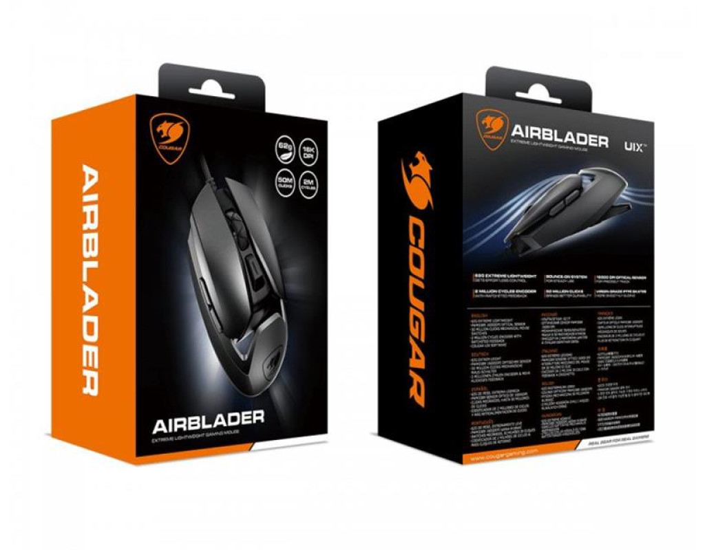 | AIRBLADER - втілення легкості. Керуючись правилом «форма слідує за функцією» Cougar спробували поєднати мінімальну область дотику при використанні миші, а потім надати їй абсолютно нову форму. Миша не тільки дуже легка, але і надає прекрасні тактильні відчуття. Симетричний і компактний дизайн більше підходить для когтявого хвата. Для тих, хто віддає перевагу легким миші, AIRBLADER пропонує плавне управління з високою точністю і абсолютно новий унікальний дизайн.