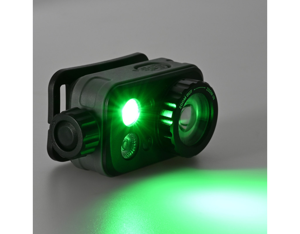 - GREEN MIDDLE (Режим зеленого світла середньої яскравості) – яскравість світла 20Lm. Дистанція освітлення налічує 10м. Тривалість роботи 28год. Інтенсивність світлового потоку 12cd.