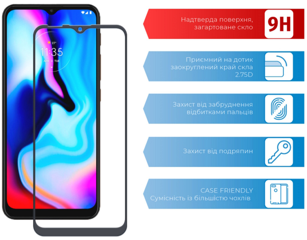 • Рівень міцності: 9H. Мінімізує ризик пошкодження передньої панелі мобільного пристрою під час повсякденного використання.