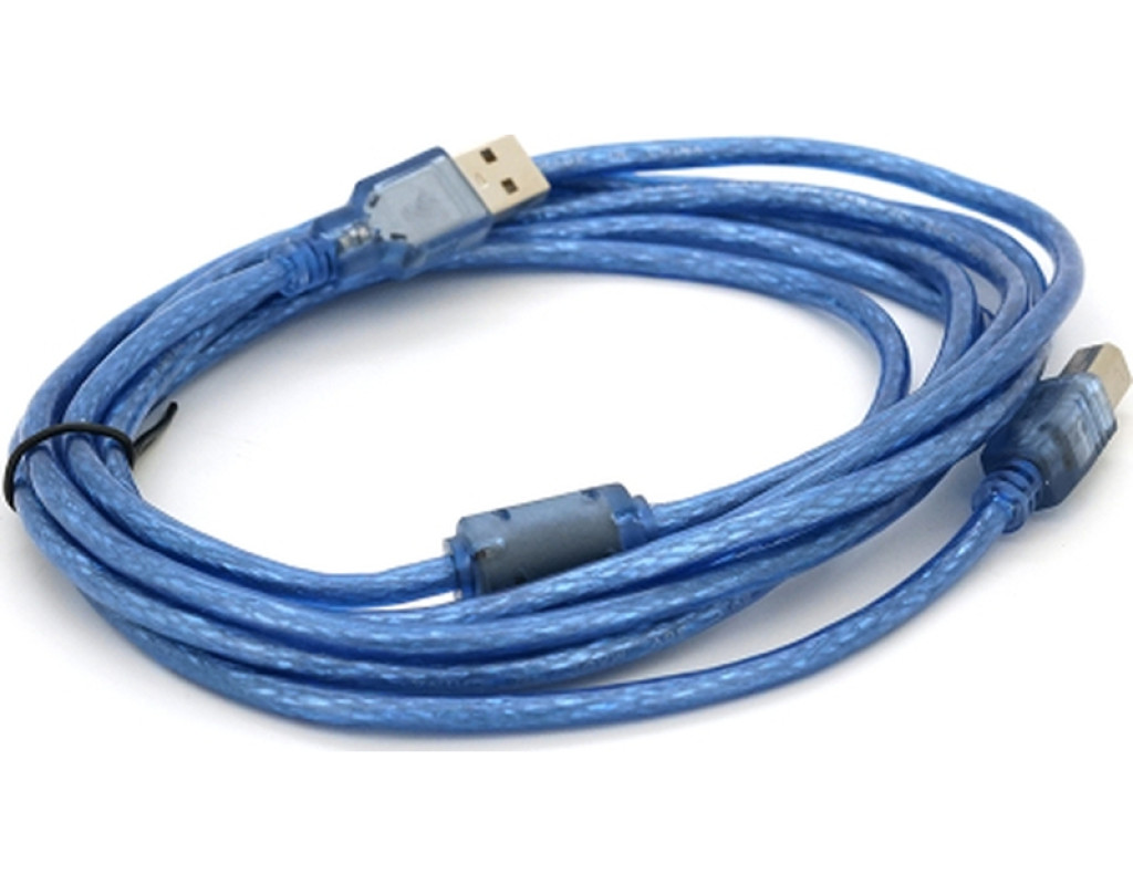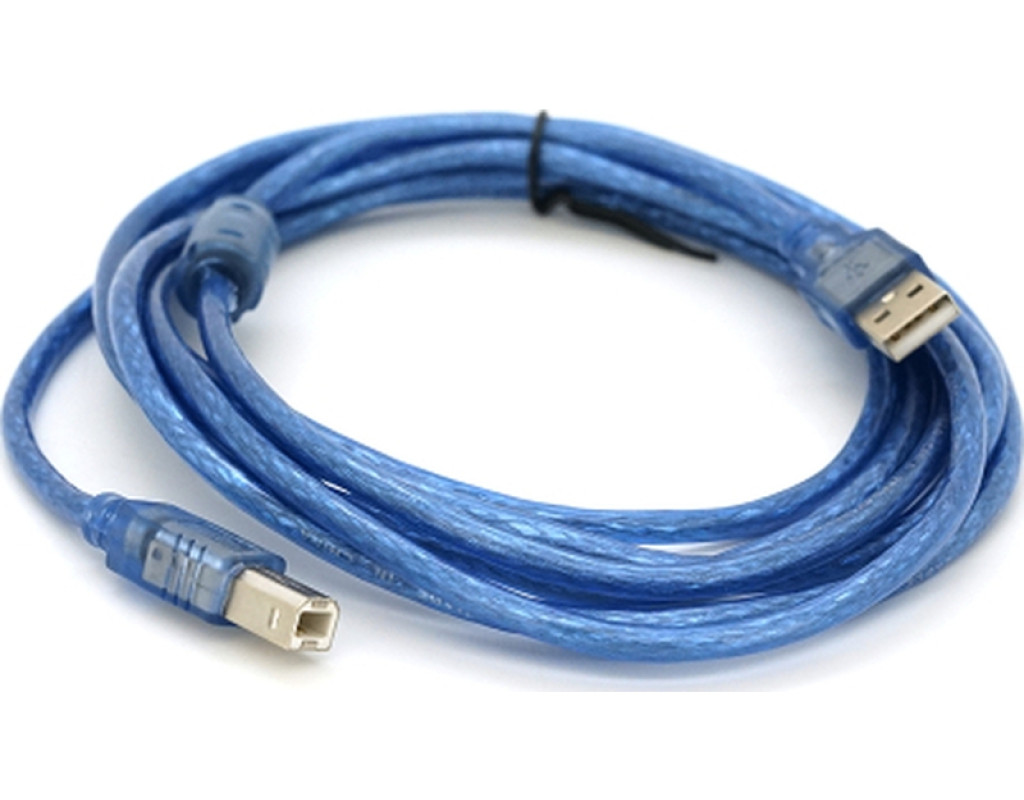 1. Тип кабелю: USB 2.0. 2. Рознімання: AM (Type A Male) - BM (Type B Male). 3. Довжина кабелю: 3.0 метри. 4. Ферріт: 1 штука. 5. Колір: прозорий синій.