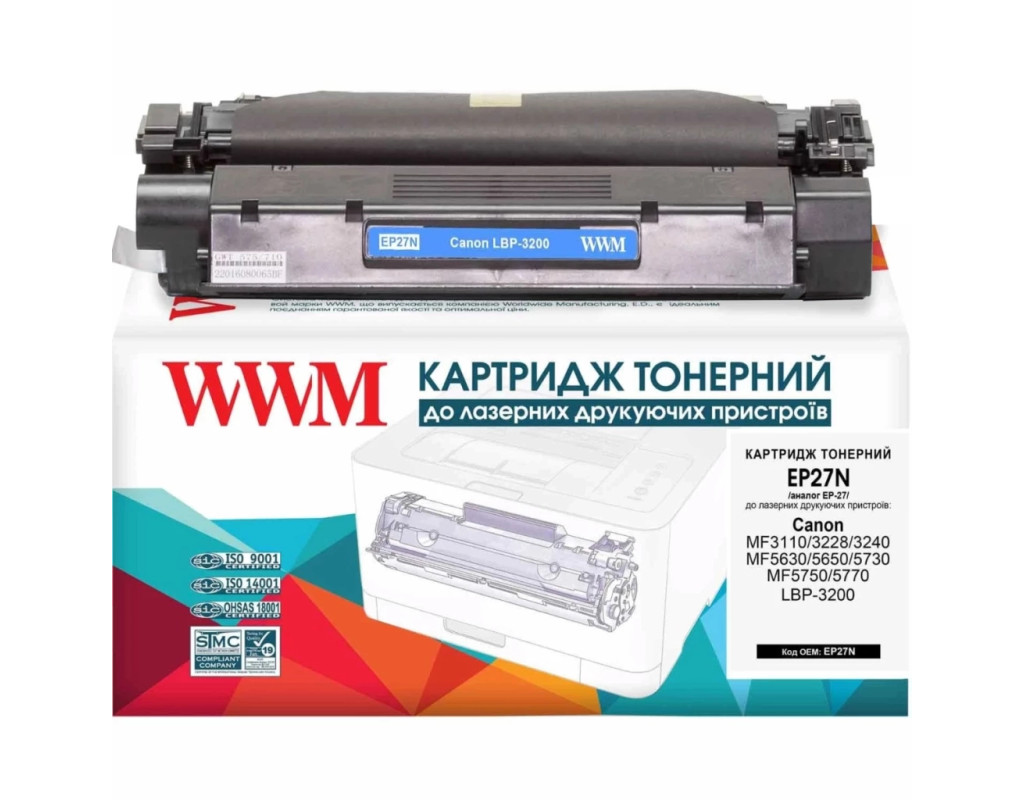 | Картридж WWM для Canon EP-27 (EP27N) це якість друку і ресурс, які тестуються за міжнародним стандартом STMC. Витрата залежить від того, наскільки сторінка заповнена. На стандартній сторінці тексту площа під чорнилом складає 5%. Це стандартна характеристика заповнення тонером поверхні паперу, і норми витрати тонера (ресурс картриджа) наводяться саме по ній. Відчуйте надійне і професійну якість друку з даними картриджем. Картриджі WWM - це продукція яка розроблена разом з обладнанням як єдине ціле для досягнення найкращих результатів друку. Жорсткий контроль якості забезпечується на усіх етапах виробництва. Висока якість друку досягається завдяки строгій відповідності необхідних вимог з фізичного розміру часток, хімічному складу, температурі плавлення і електростатичним властивостям тонера. Використання оригінальних витратних матеріалів - це гарантія якості друку і працездатності Вашого апарату. Асортимент картриджів WWM підходить до всіх різновидів популярних моделей принтерів і МФУ. |
